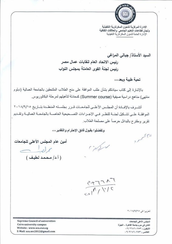 قرار المجلس الأعلى للجامعات، بإقتصار منح الجامعة العمالية درجة "دبلوم مهني