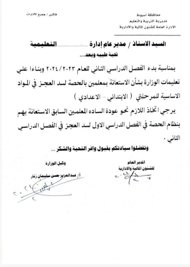 عممت مديرية التربية والتعليم والتعليم الفني بمحافظة أسيوط، فاكس على الإدارات التعليمية، بشأن سد العجز في أعداد المعلمين بالفصل الدراسي الثاني للعام الدراسي الحالي 2023/2024.