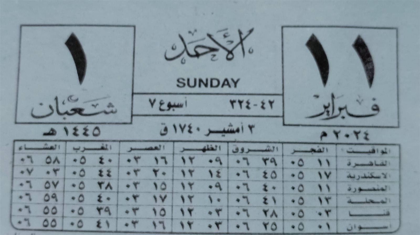 اليوم الأحد يصادف 3 أمشير 1740ق، في التاريخ القبطي.
