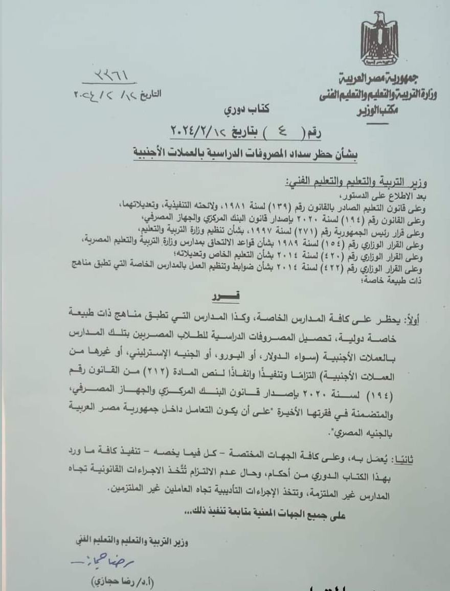 وأوضحت أنه بعد الإطلاع على الدستور وعلى قانون التعليم الصادر بالقانون رقم (۱۳۹) لسنة ۱۹۸۱، ولائحته التنفيذية، وتعديلاتهما، وعلى القانون رقم (۱۹٤) لسنة ۲۰۲۰ بإصدار قانون البنك المركزي والجهاز المصرفي وعلى قرار رئيس الجمهورية رقم (۲۷۱) لسنة ۱۹۹۷، بشأن تنظيم وزارة التربية والتعليم، وعلى القرار الوزاري رقم (١٥٤) لسنة ۱۹۸۹ بشأن قواعد الالتحاق بمدارس وزارة التربية والتعليم المصرية وعلى القرار الوزاري رقم (٤۲۰) لسنة ۲۰۱٤ بشأن التعليم الخاص وتعديلاته؛ وعلى القرار الوزاري رقم (٤۲۲) لسنة ۲۰۱٤ بشأن ضوابط وتنظيم العمل بالمدارس الخاصة التي تطبق مناهج ذات طبيعة خاصة.