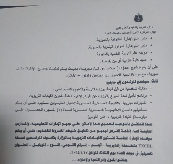 وشددت على ضرورة الإعلان علي جميع الإدارات التعليمية والمدارس التابعة لها، لإتاحة الفرص لجميع من تنطبق عليهم الشروط للتقديم على أن يستم موافاه الإدارة العامة لشئون القيادات التربوية بالوزارة بكشوف المرشحين نسخة EXCEL متضمنة المديرية - الإسم - الرقم القومي - النوع - الموبايل - العنوان تفصيليا) في موعد اقصاه يوم الثلاثاء الموافق ٢٠٢٤/٢/٢٧.