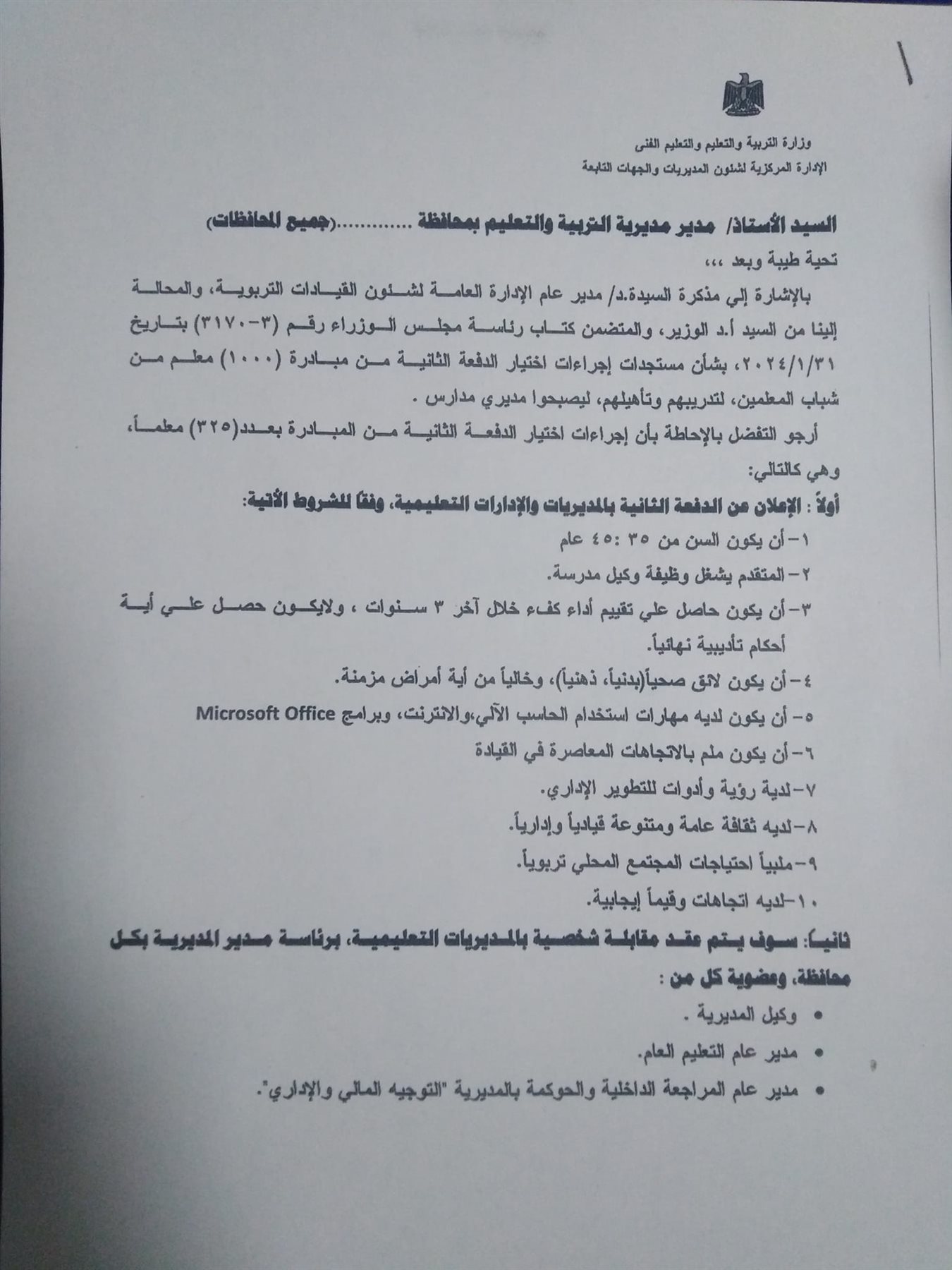 عممت وزارة التربية والتعليم والتعليم الفني، خطاب على المديريات التعليمية، عن مستجدات اجراءات اختيار الدفعة الثانية من مبادرة (۱۰۰۰) معلم من شباب المعلمين، لتدريبهم وتأهيلهم، ليصبحوا مديري مدارس.