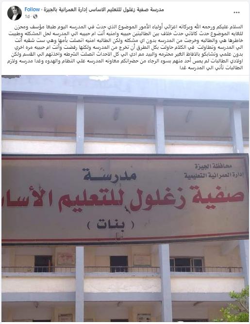 يذكر أن أنباءًا انتشرت خلال الساعات الماضية بشأن مشاجرة بين طالبات مدرسة صفية زغلول، نتج عنها إصابة طالبة بعد قيام شقيق إحدى زميلاتها بإصابتها بسلاح أبيض، كما تدخلت أسرة الطالبة المعتدى عليها وقاموا بإصابة شقيق الطالبة المتهم بالتعدي على ابنتهم بإصابات في رأسه، وتم ضبط الطرفين من قبل أجهزة أمن الجيزة.