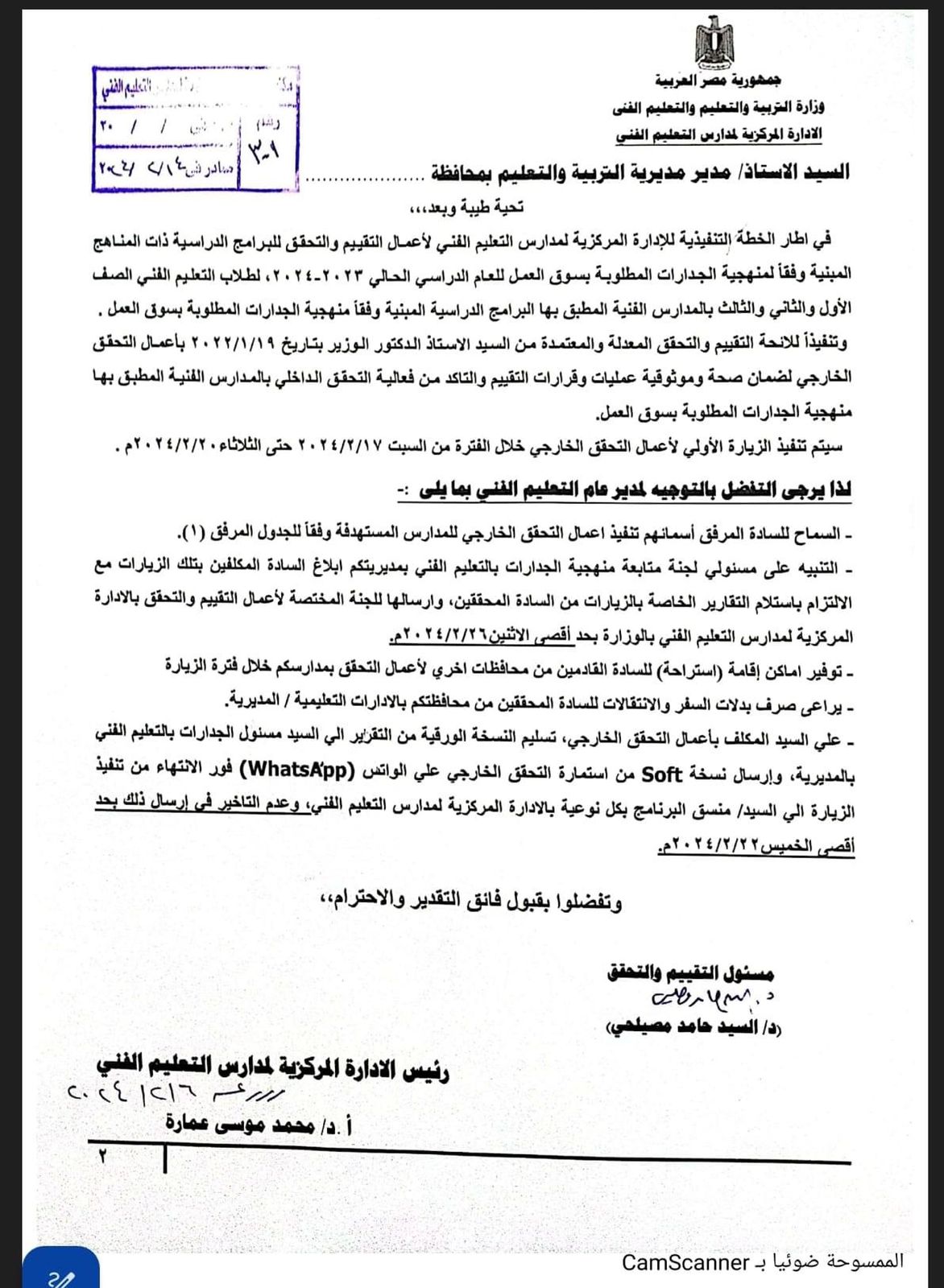 وأشارت وزارة التربية والتعليم، إلى أنه سيتم تنفيذ الزيارة الأولى لأعمال التحقق الخارجي خلال الفترة من السبت 17 فبراير حتى الثلاثاء 20 من نفس الشهر، لذا يرجى التوجيه المدير عام التعليم الفني بما يلى:-