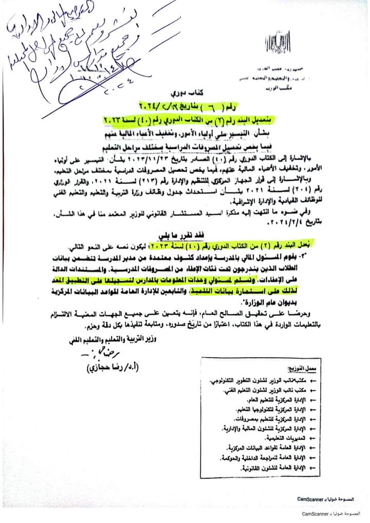 وتابعت الوزارة: حرصا على تحقيق الصالح العام، فإنه يتعين على جميع الجهات المعنية الالتزام بالتعليمات الواردة في هذا الكتاب اعتبارا من تاريخ صدوره، ومتابعة تنفيذها بكل دقة وحزم، فى إطار التيسير على أولياء الأمور، وتخفيف الأعباء المالية عنهم فيما يخص تحصيل المصروفات الدراسية بمختلف مراحل التعليم.