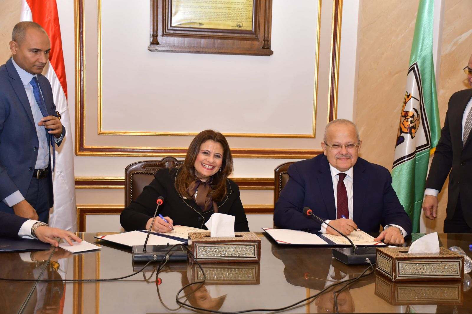 وقع الدكتور محمد عثمان الخشت رئيس جامعة القاهرة، والسفيرة سها جندي وزيرة الدولة للهجرة وشئون المصريين بالخارج، بقاعة أحمد لطفي السيد، مذكرة تفاهم مشترك في مجالات الأنشطة والتدريب والندوات وبرامج التوعية بمجالات الهجرة والتنمية.