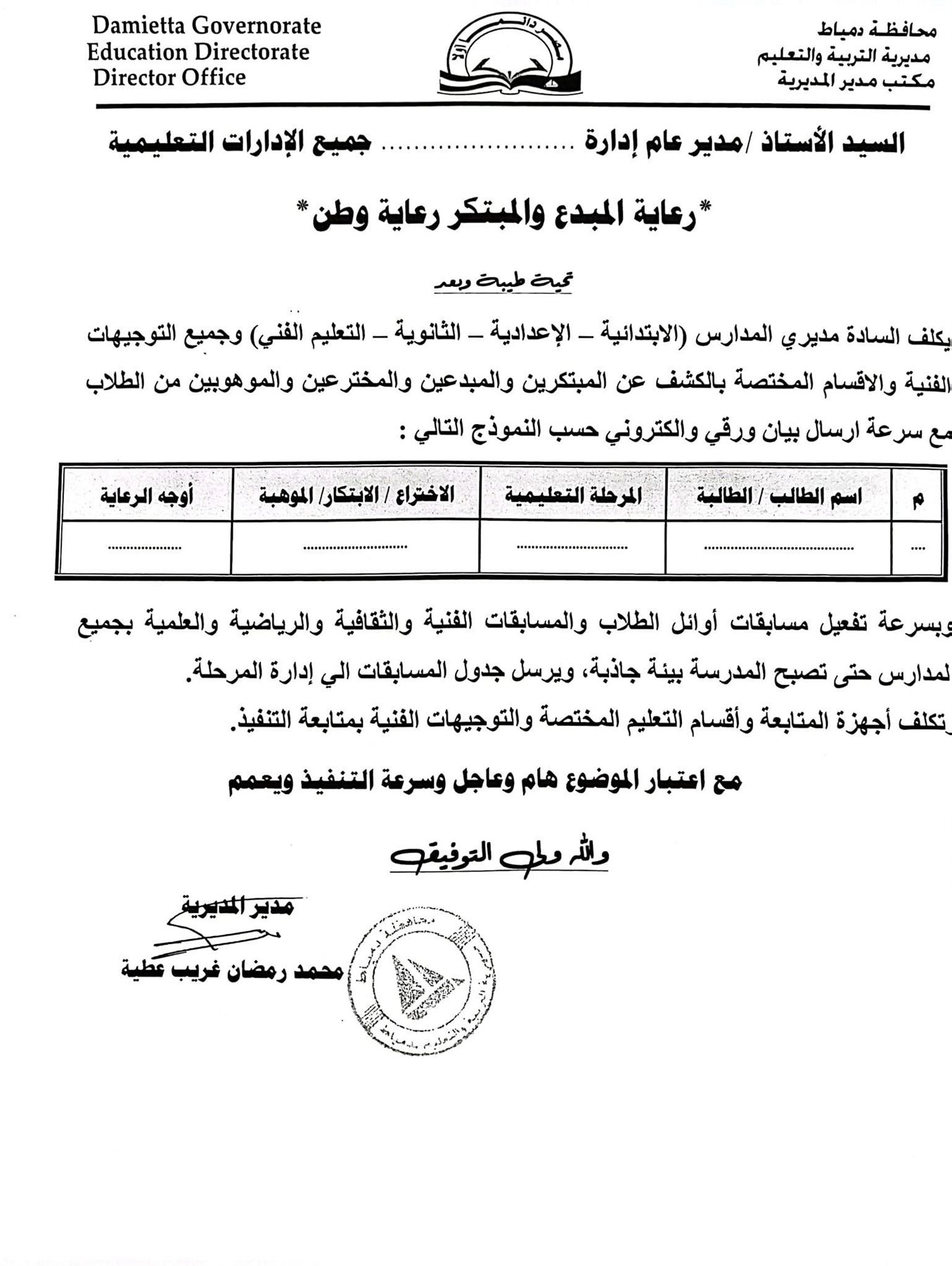 كلفت مديرية التربية والتعليم والتعليم الفني بمحافظة دمياط، مديري المدارس (الابتدائية، الإعدادية، الثانوية، التعليم الفني) وجميع التوجيهات الفنية والأقسام المختصة بالكشف عن المبتكرين والمبدعين والمخترعين والموهوبين من الطلاب.