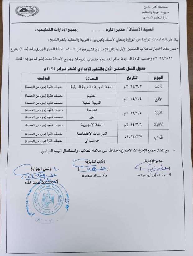 مواعيد اختبارات شهر فبراير للصفين الأول والثاني الإعدادي في كفر الشيخ