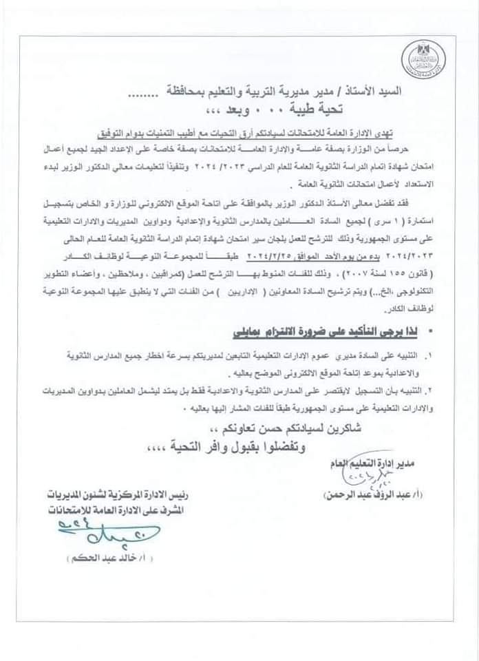 التنبيه على مديري عموم الإدارات التعليمية التابعين للمديرية بسرعة اخطار جميع المدارس الثانوية والإعدادية بموعد إتاحة الموقع الالكتروني الموضح بعاليه.