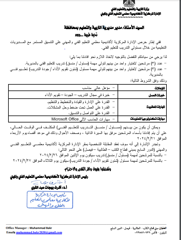 - عدد (3) مرشحين لاختيار واحد من بينهم لتولي مهمة مسؤول / منسق تدريب للتعليم الفني بالمديرية.
