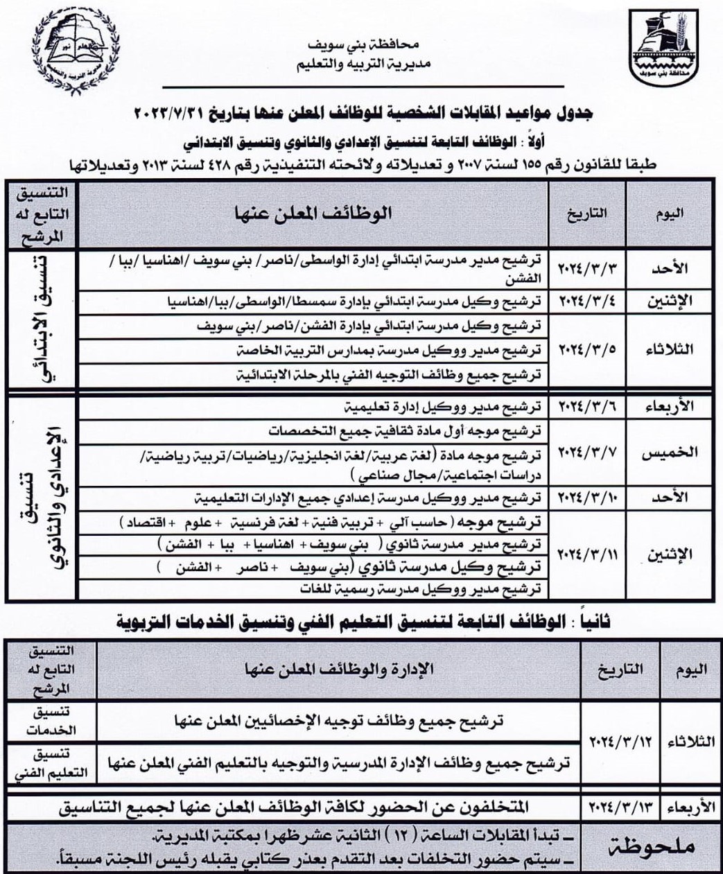 وأشار هاني عنتر وكيل التعليم، إلى أنه تم تشكيل اللجنة المُكلفة بتقييم واختيار قيادات الإدارة المدرسية والتوجيه بالمديرية لإجراء المقابلات الشخصية لشغل تلك الوظائف، والتي من المقرر أن تبدأ اعتبارًا من الأحد المقبل 3 مارس 2024 وتستمر حتى الأربعاء 13 من نفس الشهر بمكتبة المديرية