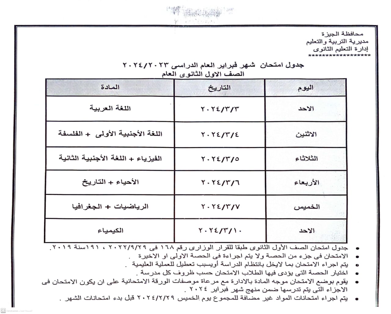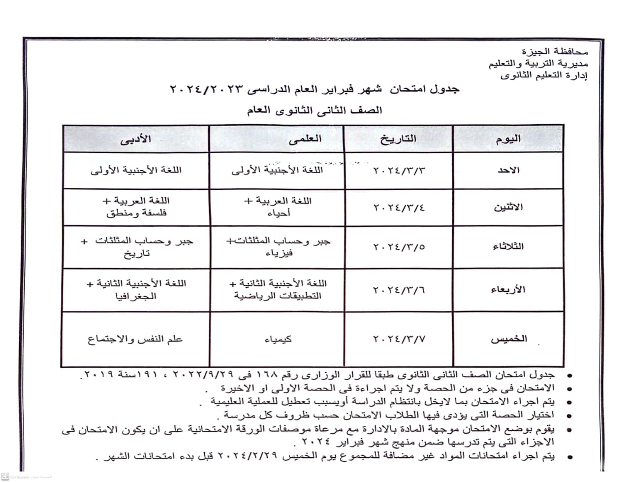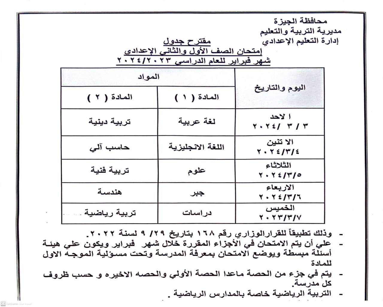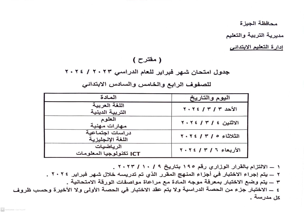 أكد أشرف سلومة وكيل وزارة التربية والتعليم والتعليم الفني بمحافظة الجيزة، انطلاق امتحانات شهر فبراير 2024 لجميع المراحل " ابتدائى – إعدادى – ثانوى "لطلاب المدارس بداية من يوم الأحد 3 مارس 2024 وفقا للجداول المعلن على النحو التالي: