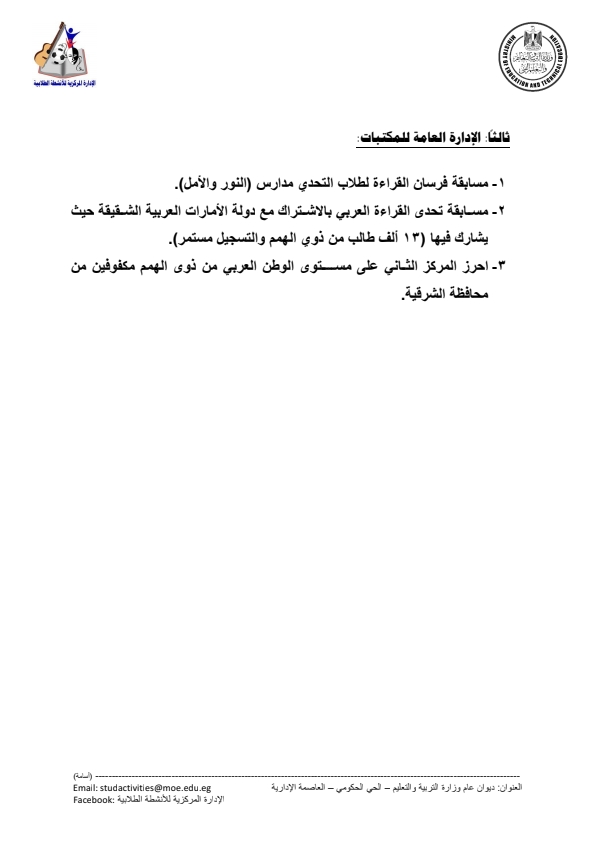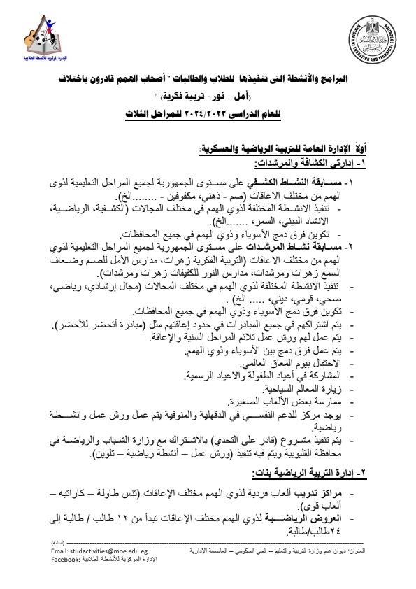 - تقديم كافة أوجه الدعم للطلاب من ذوي الاحتياجات الخاصة ووضعهم على رأس أولويات الخطة الاستراتيجية لوزارة التربية والتعليم ٢٠٢٤ / ٢٠٢٩ التي تركز على تقديم تعليم دون تمييز.