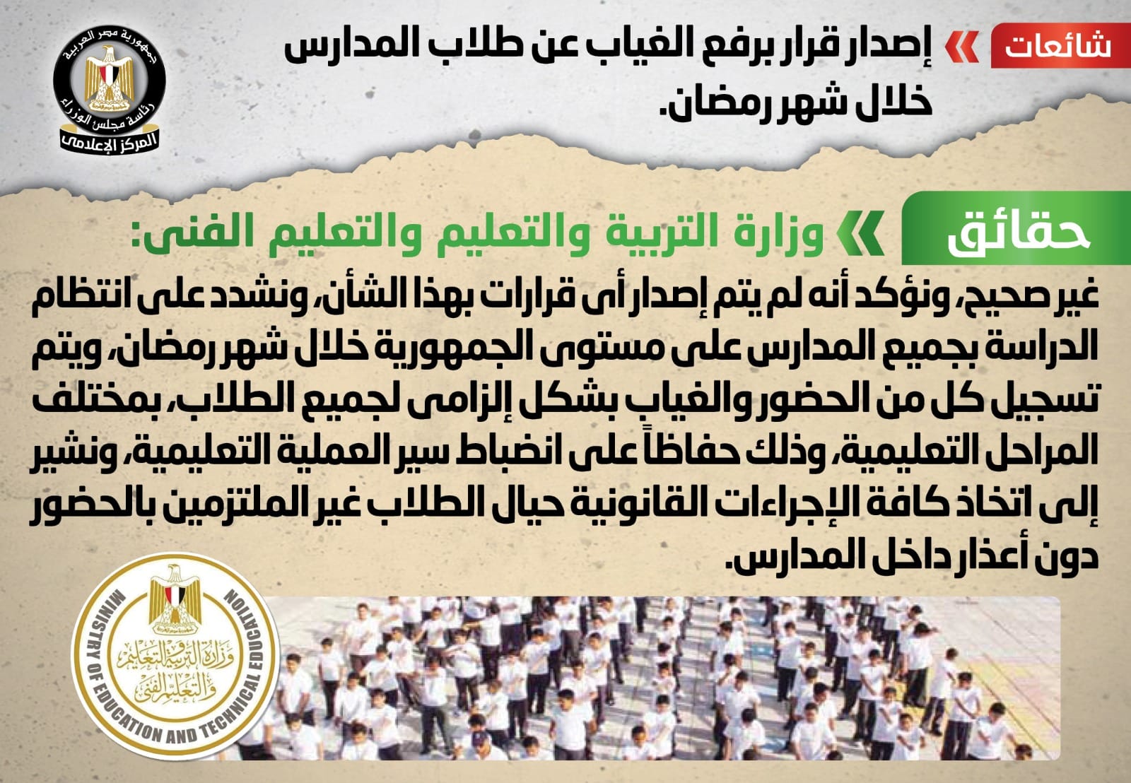 وأكدت وزارة التربية والتعليم والتعليم الفني، أنه لا صحة لرفع الغياب عن طلاب المدارس خلال شهر رمضان، وأنه لم يتم إصدار أي قرارات بهذا الشأن، مُشددةً على انتظام الدراسة بجميع المدارس على مستوى الجمهورية خلال شهر رمضان.