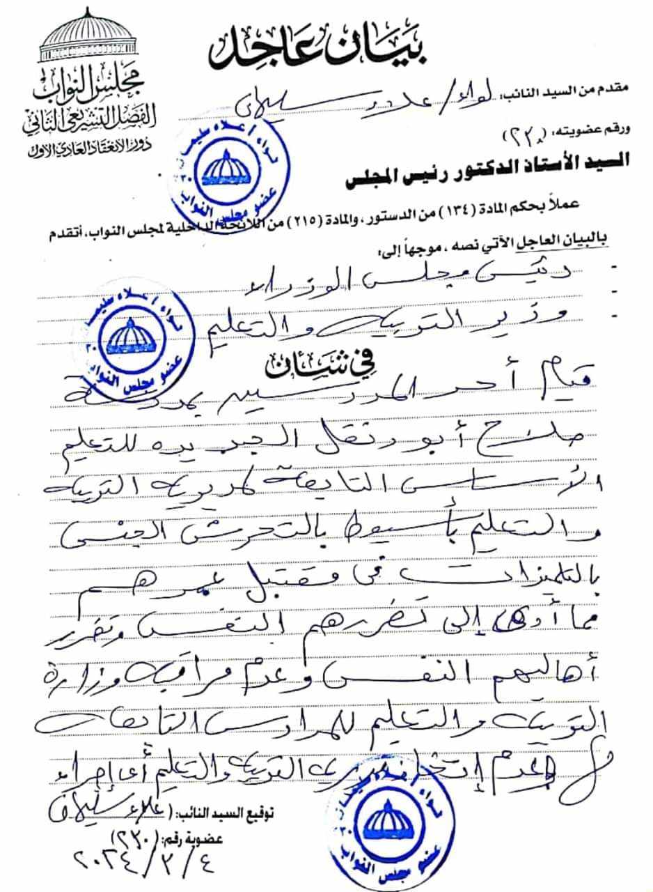تقدم النائب علاء سليمان، عضو مجلس النواب عن محافظة أسيوط، بطلب إحاطة إلى المستشار الدكتور حنفي جبالي، رئيس مجلس النواب، موجه إلى الدكتور مصطفى مدبولى رئيس مجلس الوزراء، والدكتور رضا حجازي وزير التربية والتعليم والتعليم الفني، بسبب قيام أحد المدرسين بالتحرش بعدد من الطلبات بمدرسة أبو دنقل الجديدة التابعة لمديرية التربية والتعليم بمحافظة أسيوط.