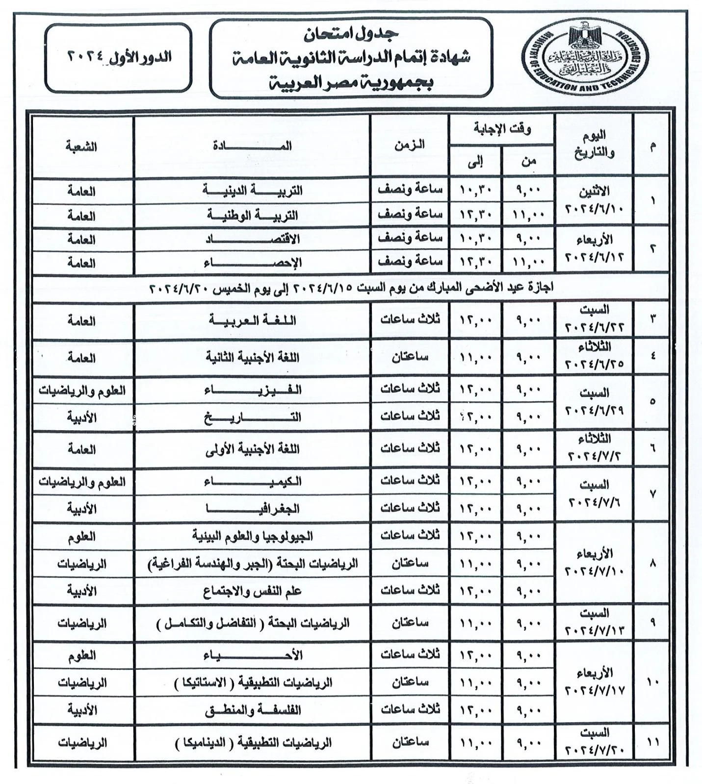 أعلنت وزارة التربية والتعليم والتعليم الفني جدول امتحانات الثانوية العامة 2024 لطلاب الشعبة العلمية والأدبية والذي جاء كما يلي:-