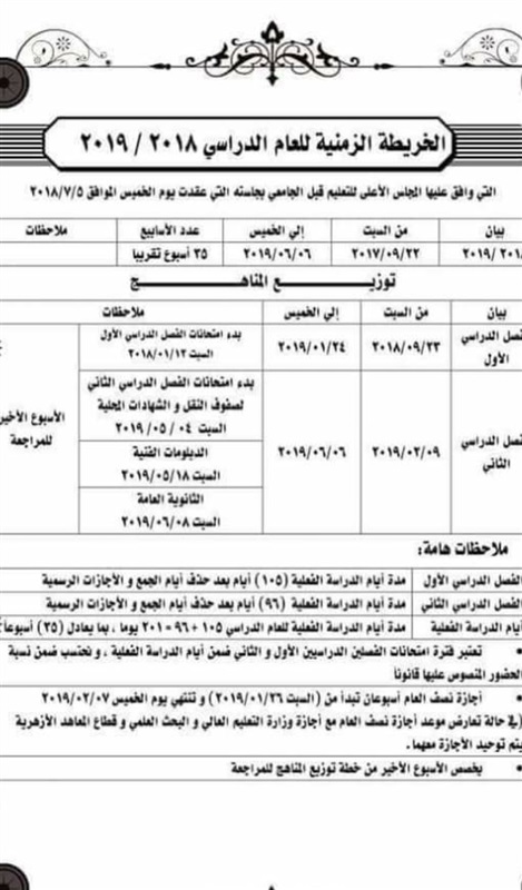 أعلنت وزارة التربية والتعليم، والتعليم الفنى الخريطة الزمنية للعام الدراسي 2018/2019، ونشرت فيها مواعيد امتحانات الترم الأول 2018 والترم الثاني للعام الدراسي 2018-2019 والتي جاءت كلتالي:
