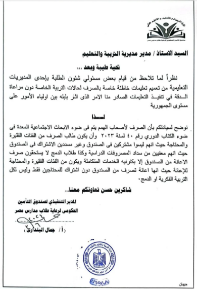 وتابعت وزارة التربية والتعليم والتعليم الفنى: بأن الصرف لأصحاب الهمم يتم فى ضوء الأبحاث الاجتماعية المعدة في ضوء الكتاب الدوري رقم 40 لسنة 2023 وأن يكون طالب الصرف من الفئات الفقيرة والمحتاجة، حيث أنهم ليسوا مشتركين في صندوق التأمين الحكومى لرعاية طلاب مدارس مصر، وغير مسددين الإشتراك في الصندوق، حيث أنهم معفيين من سداد المصروفات الدراسية وكذا طلاب الدمج لا يستحقون صرف الاعانة من الصندوق إلا بكارنيه الخدمات المتكاملة ويكون من الفئات الفقيرة والمحتاجة للإعانة حيث أنها إعانة تصرف من الصندوق دون اشتراك للمحتاجين فقط وليس لكل التربية الفكرية أو الدمج.