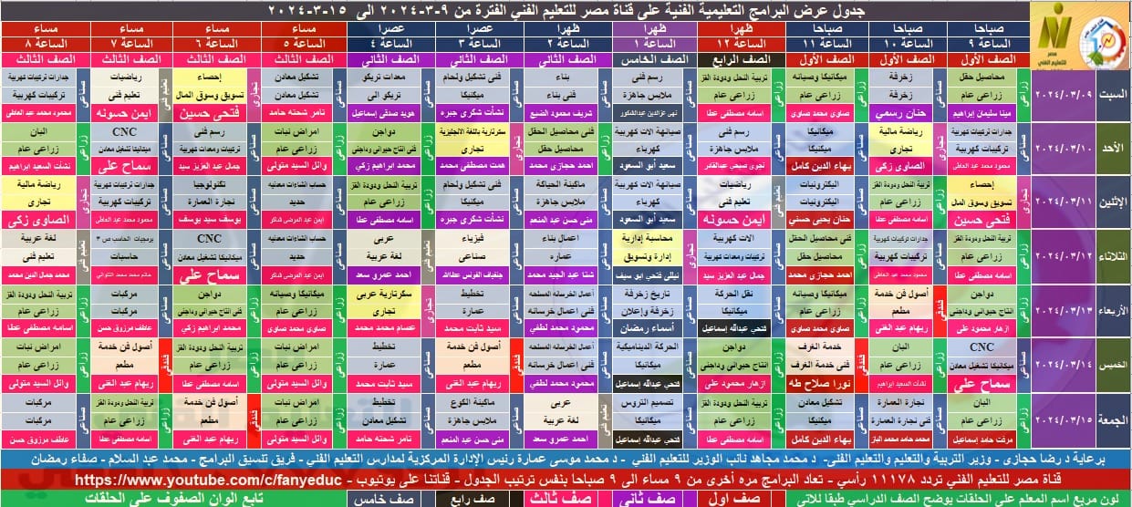 أعلنت قناة مصر للتعليم الفني، جدول عرض البرامج التعليمية الفنية على قناة مصر للتعليم الفني الفترة من 09-03-2023 الى 15-03-2024