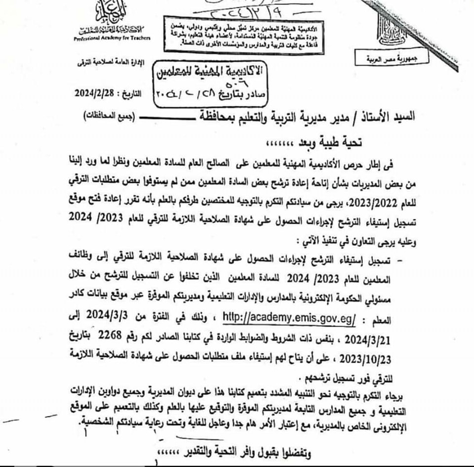 - تسجيل إستيفاء الترشح لإجراءات الحصول على شهادة الصلاحية اللازمة للترقي إلى وظائف المعلمين للعام 2023 2024 للمعلمين الذين تخلفوا عن التسجيل للترشح من خلال مسئولي الحكومة الإلكترونية بالمدارس والإدارات التعليمية ومديريتكم الموقرة عبر موقع بيانات كادر المعلم: http://academy.emis.gov.eg ، وذلك في الفترة من 2024/3/3 إلى 2024/3/21، بنفس ذات الشروط والضوابط الواردة في كتابنا الصادر لكم رقم 2268 بتاريخ 2023/10/23، على أن يتاح لهم إستيفاء ملف متطلبات الحصول على شهادة الصلاحية اللازمة للترقي فور تسجيل ترشحهم.