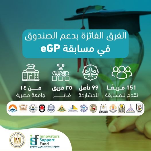 وأشار المدير التنفيذي لـ صندوق رعاية المبتكرين والنوابغ، إلى أنه تقدم لبرنامج eGP الذي تم إطلاقه نوفمبر الماضي 151 فريقًا، وتأهل منهم للمشاركة في البرنامج 99 فريقًا، وبعد عملية تحكيم دقيقة من جانب خبراء في التخصص ومجال ريادة الأعمال، فاز بدعم صندوق رعاية المبتكرين والنوابغ 25 فريقًا من 14 جامعة (القاهرة، عين شمس، أسيوط، المنصورة، حلوان، سوهاج، قناة السويس، دمياط، بنها، الأكاديمية العربية للعلوم والتكنولوجيا والنقل البحري، المصرية اليابانية للعلوم والتكنولوجيا، العريش، أكتوبر للعلوم الحديثة والآداب، 6 أكتوبر).