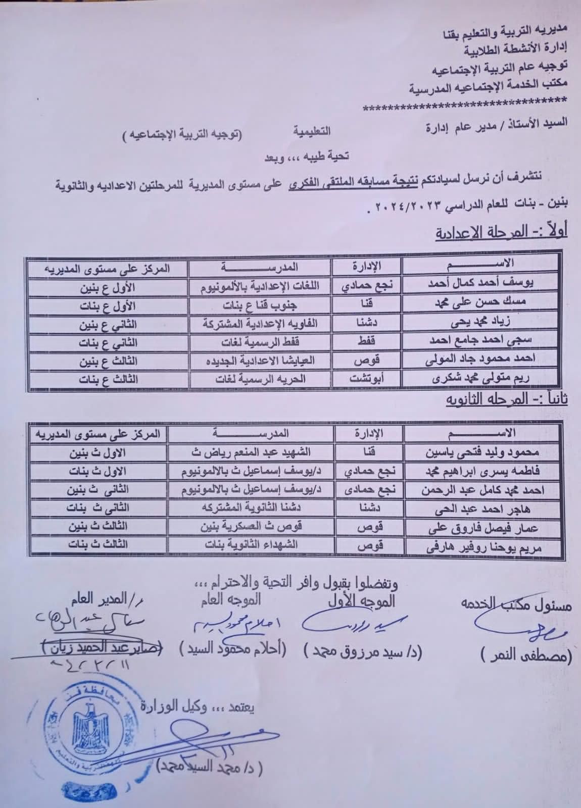 أعلن الدكتور محمد السيد وكيل وزارة التربية والتعليم بقنا نتيجة مسابقة الملتقى الفكري والتي أعدها توجيه عام التربية الاجتماعية للمرحلتين الاعدادي والثانوي للعام الدارسين الحالي 2023 / 2024.