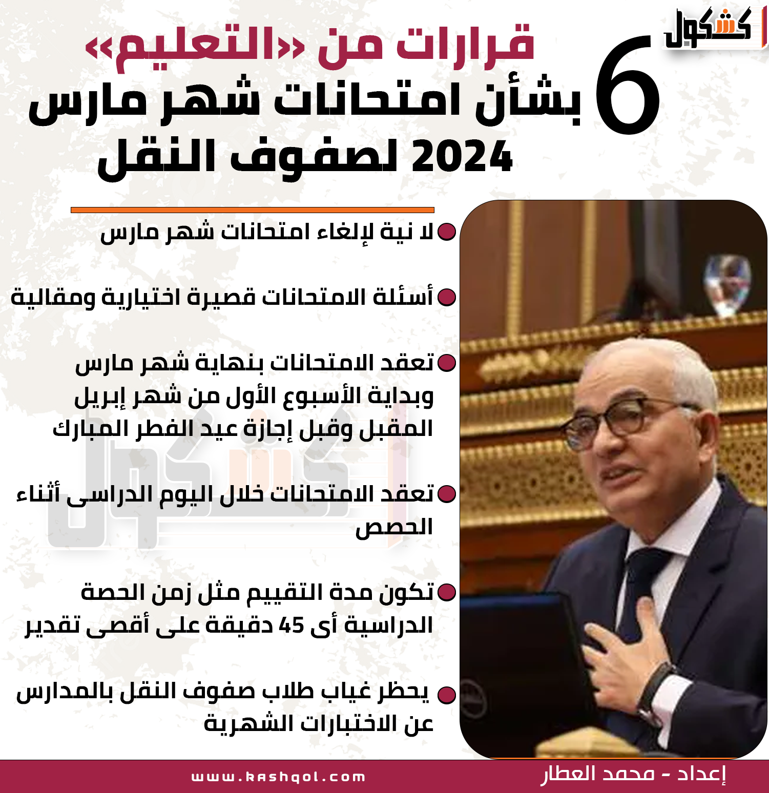 وفيما يلي يقدم "كشكول" كافة قرارات وزارة التربية والتعليم والتعليم الفني بشأن امتحانات شهر مارس 2024 الخاصة بصفوف النقل: