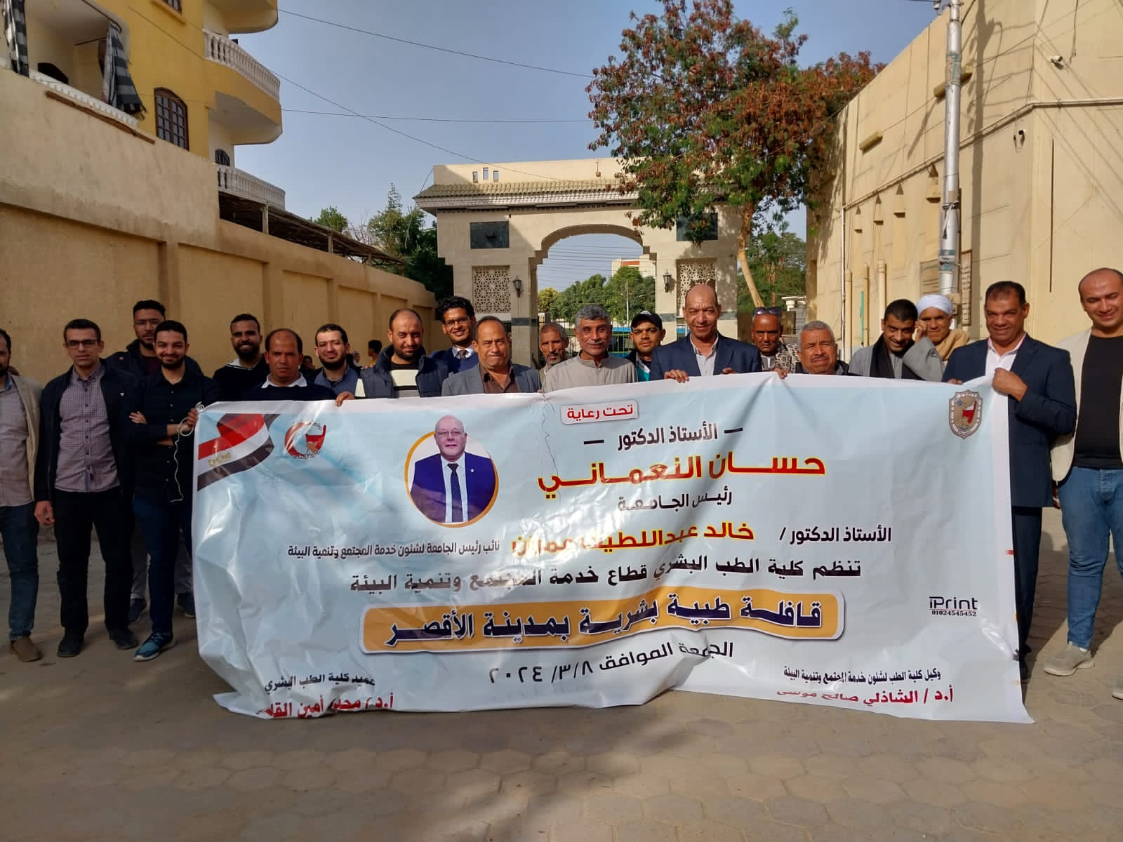 صرح الدكتور حسان النعماني رئيس جامعة سوهاج، أن قطاع خدمة المجتمع وتنمية البيئة بكلية الطب البشري نظم قافلة طبية مجانية لخدمة أهالي مدينة الاقصر، وذلك بمقر ساحة فضيلة الشيخ أحمد الطيب شيخ الأزهر الشريف بمنطقة القرنة بالبر الغربي.