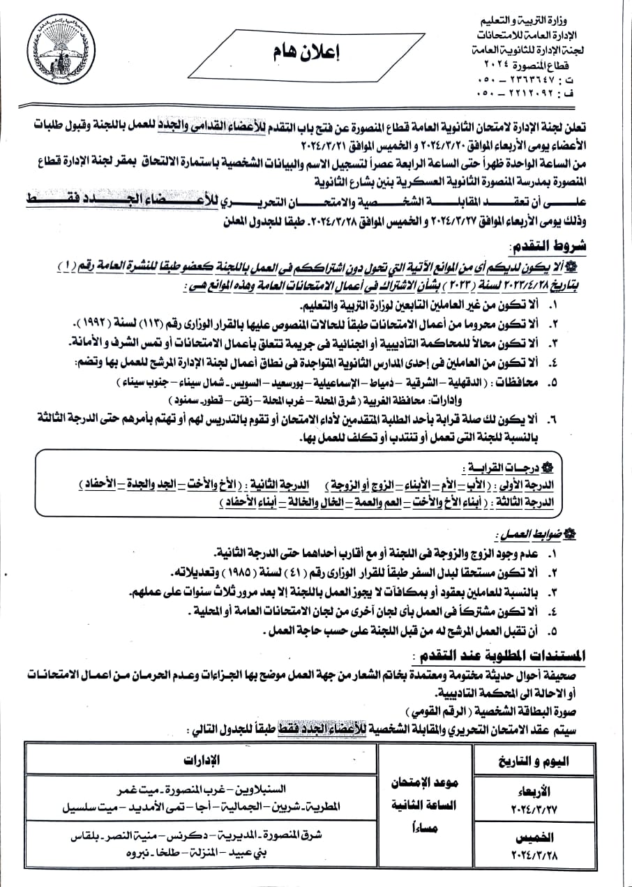 أعلنت لجنة الإدارة لامتحان الثانوية العامة قطاع المنصورة عن فتح باب التقدم للأعضاء القدامى والجدد للعمل باللجنة وقبول طلبات الأعضاء يومى الأربعاء الموافق ۲۰۲٤/٣/٢٠ والخميس الموافق ٢٠٢٤/٣/٢١ من الساعة الواحدة ظهرًا حتى الساعة الرابعة عصرًا لتسجيل الاسم والبيانات الشخصية باستمارة الالتحاق بمقر لجنة الإدارة قطاع المنصورة بمدرسة المنصورة الثانوية العسكرية بنين.