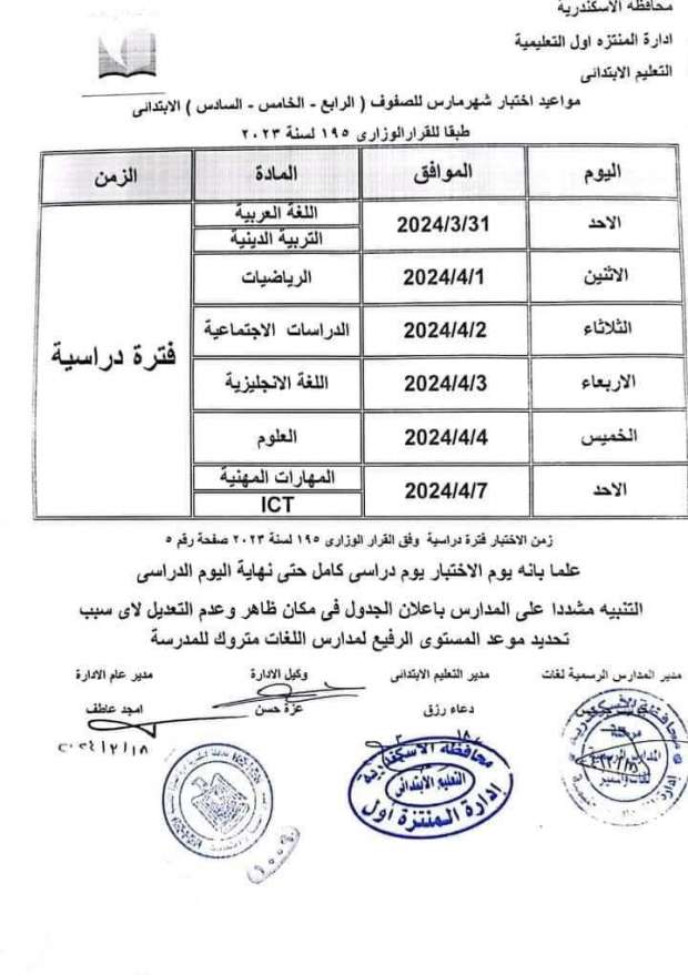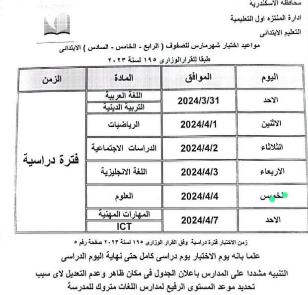 مواعيد امتحانات شهر مارس 2024 للمرحلة الابتدائية محافظة الإسكندرية
