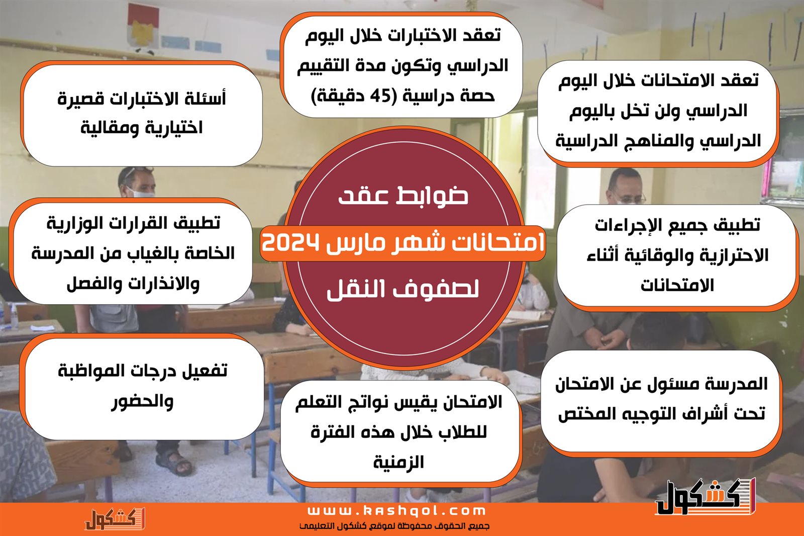 ضوابط عقد امتحانات شهر مارس 2024 لصفوف النقل (إنفوجراف)