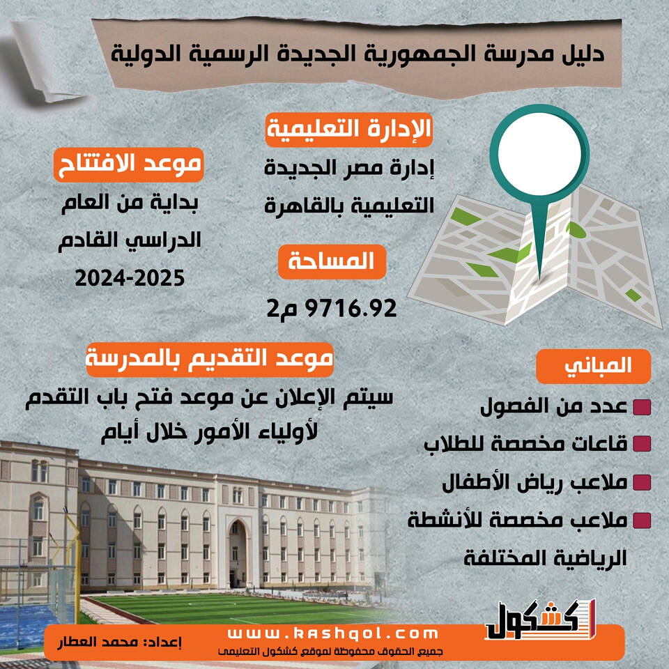 وفيما يلي يقدم "كشكول" أبرز المعلومات عن مدرسة الجمهورية الجديدة الرسمية الدولية بعد تفقد وزير التربية والتعليم والتعليم الفني لها: