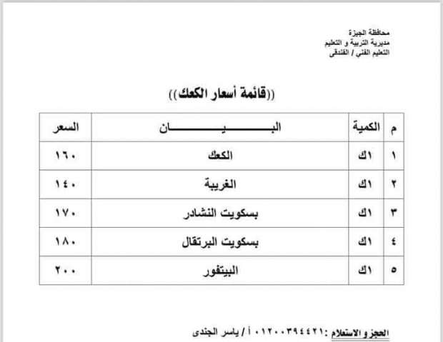 وكشفت مديرية التربية والتعليم بمحافظة الجيزة عن فتح منافذ الإدارات التعليمية لبيع كعك العيد بأيدي أبناء التعليم الفندقي وبإشراف الدكتورة صفاء القزاز، مدير عام التعليم الفني، والأسعار كالتالي: