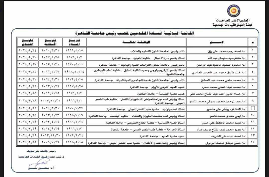 وشملت القائمة 14 مرشحا لرئاسة جامعة القاهرة وجاءت أسماؤهم كالتالي: