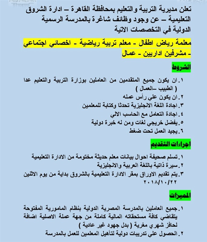 أعلنت وزارة التربية والتعليم والتعليم الفنى، بإدارة الشروق التعليمية بمحافظة القاهرة عن وجود وظائف شاغرة بالمدرسة الرسمية الدولية الحكومية تخصصات "رياض الأطفال وتربية رياضية وأخصائى اجتماعى ومشرفين إداريين وعمال".