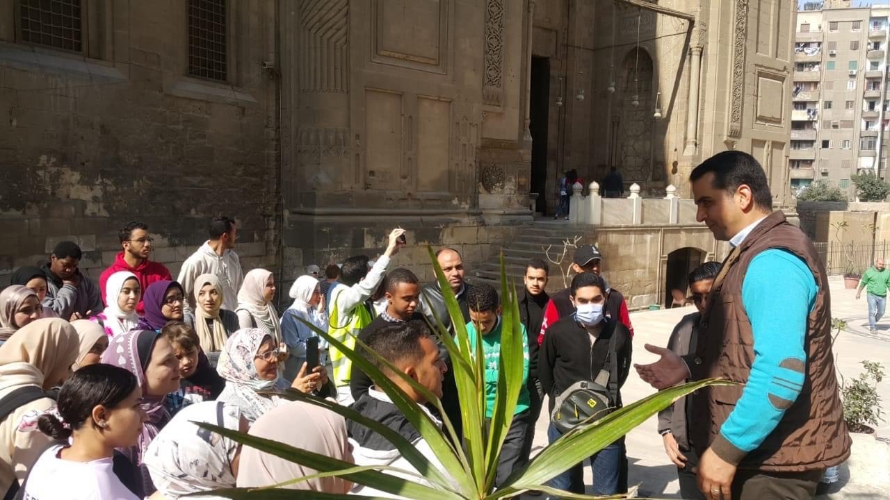 وشارك في الزيارة عدد كبير من الطلاب وأعضاء هيئة التدريس والعاملين، وتضمنت زيارة ميدان صلاح الدين لتعريف الطلاب بالأهمية التاريخية للميدان والمعالم الأثرية المطلة عليه، ودخول مسجد الرفاعي ومدرسة السلطان حسن والتعرف علي الناحية التاريخية والمعمارية والفنية له، ودخول مدافن الأسرة العلوية فيه والتي من بينها تركيبة دفن الخديوي اسماعيل ووالدته وزوجاته، والسلطان حسين كامل وزوجته، والملك أحمد فؤاد الأول ووالدته، وشاهد إيران محمد رضا بهلوي والملك فاروق وزوجته، وكذلك زيارة شارع الخليفة ومسجد أحمد بن طولون وتم تعريف الطلاب بتاريخ المسجد من الناحية المعمارية والتاريخية والفنية، وتاريخ الدولة الطولونية ومدينة القطائع.