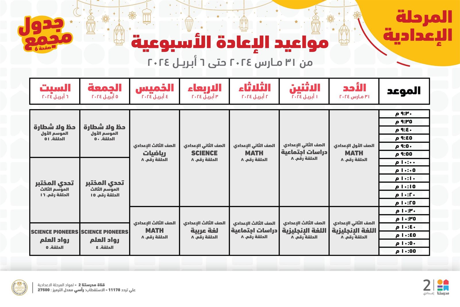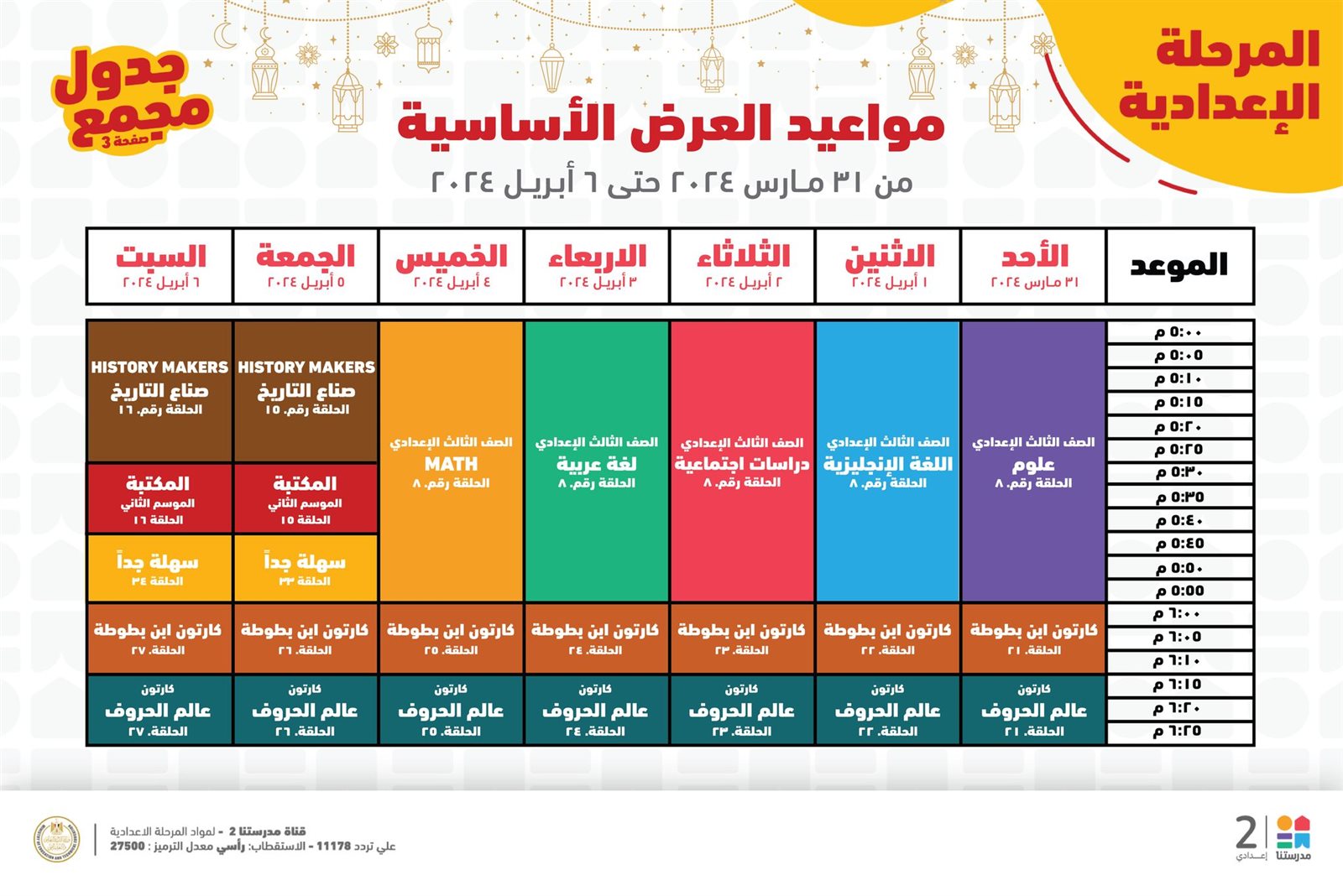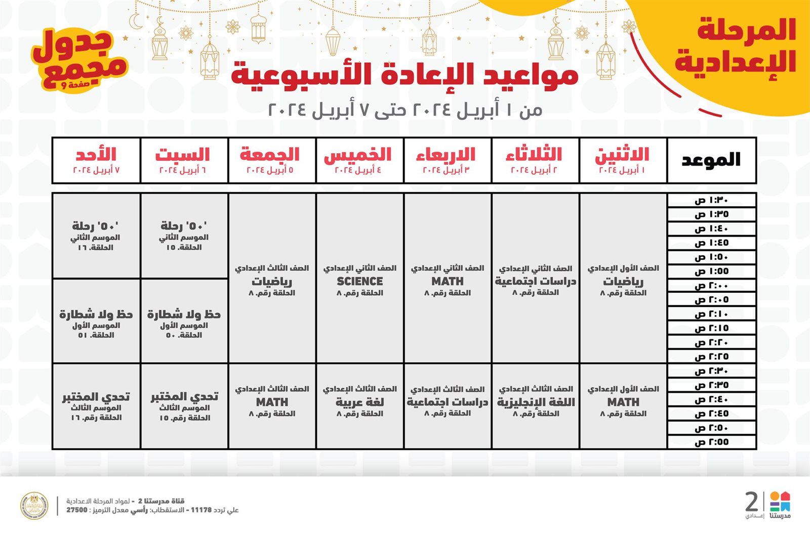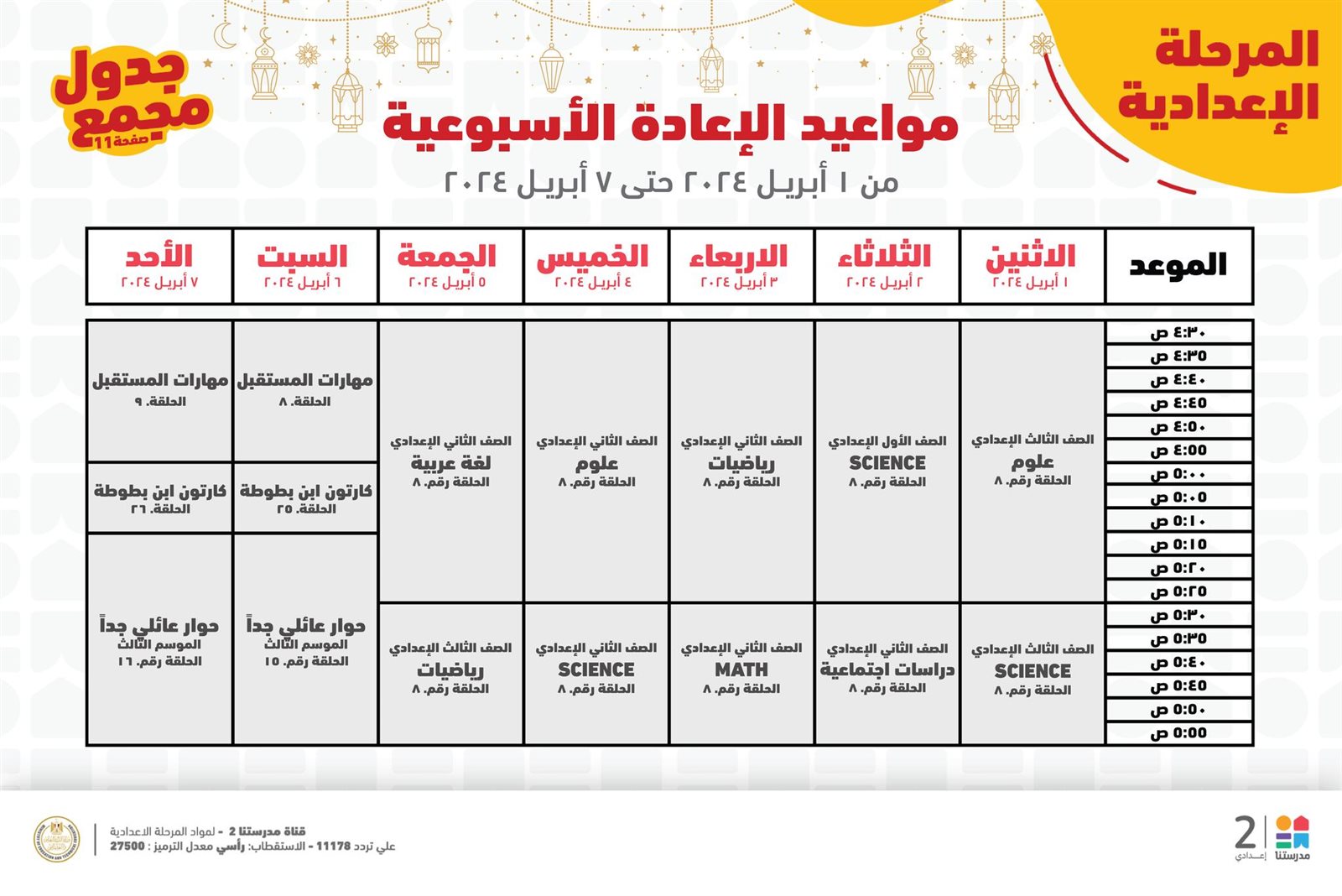 أعلنت قناة مدرستنا المرحلة الإعدادية عن جدول مواعيد عرض البرامج التعليمية مع الإعادة، على قناة "مدرستنا 2" تردد 11178 رأسي، تعرفوا عليه من خلال الصور التالية
