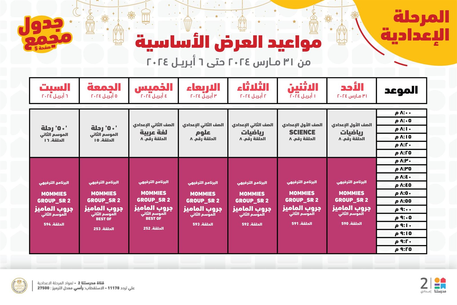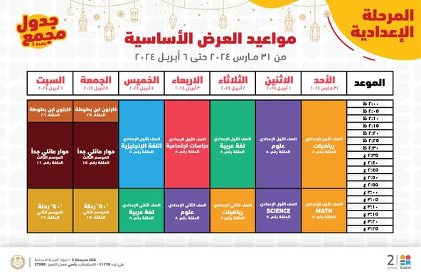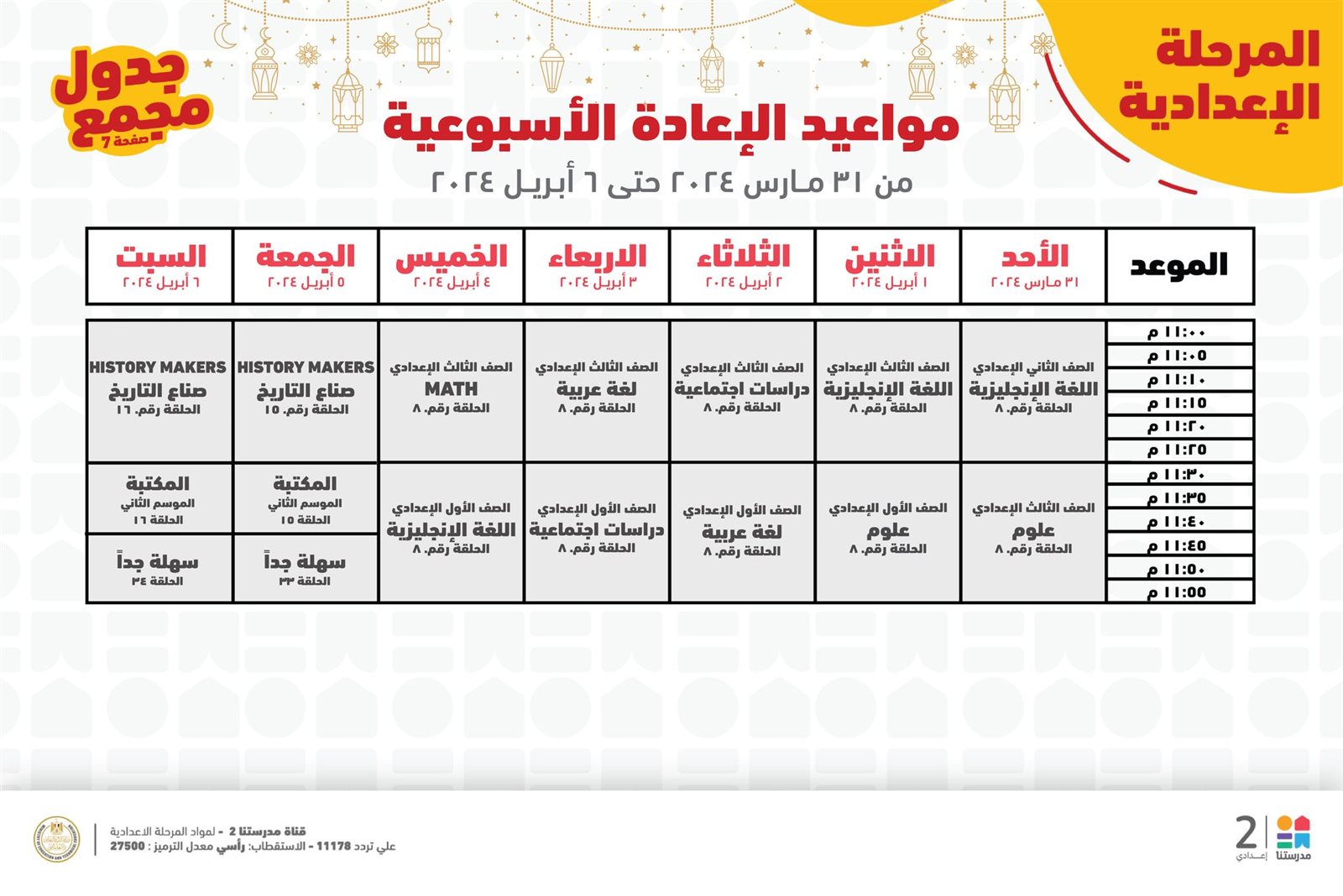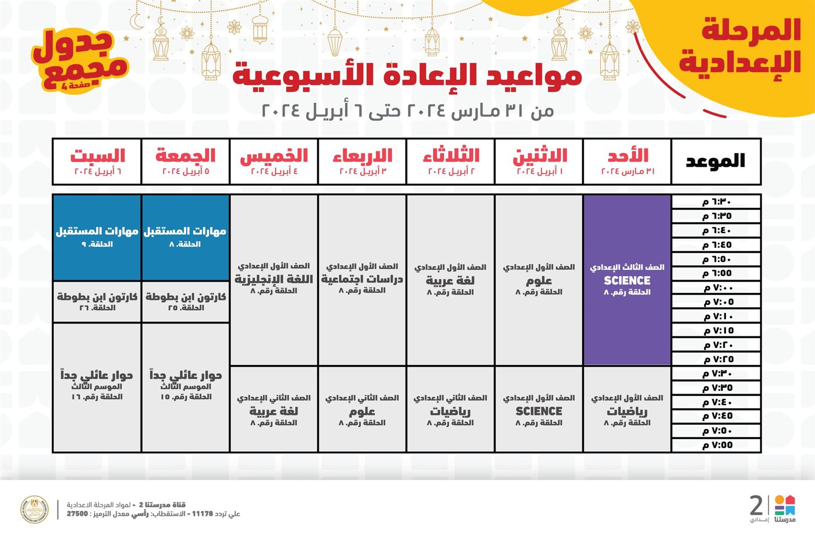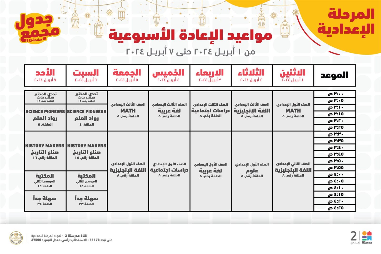أعلنت قناة مدرستنا المرحلة الإعدادية عن جدول مواعيد عرض البرامج التعليمية مع الإعادة، على قناة "مدرستنا 2" تردد 11178 رأسي، تعرفوا عليه من خلال الصور التالية