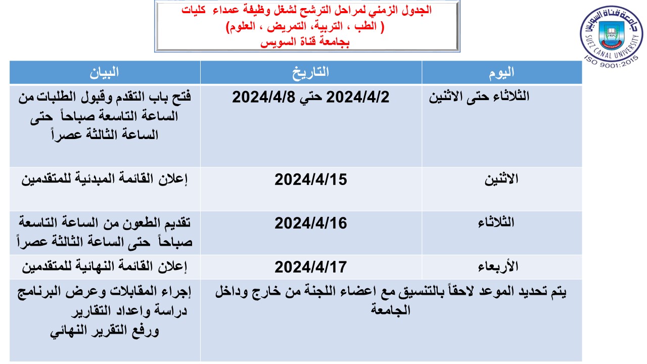 أعلنت جامعة قناة السويس عن التقدم لشغل وظيفة عمداء كليات "التربية، الطب، التمريض، العلوم"، بناء على القرار الوزاري رقم (1365) بشأن إعادة تشكيل اللجان المختصة بترشيح عمداء الكليات والمعاهد، وذلك وفقًا للشروط التالية: