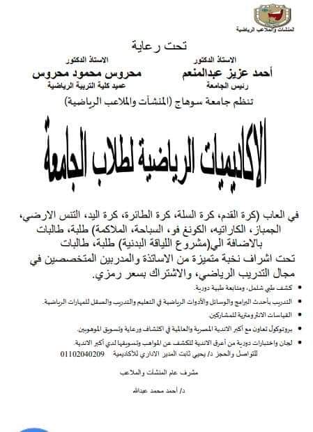 أعلن الدكتور أحمد عزيز عبد المنعم رئيس جامعة سوهاج عن بدء مشروع الأكاديميات الرياضية لطلبة وطالبات الجامعة، وأضاف أن المشروع تنظمه لجنة المنشآت والملاعب الرياضية بالجامعة ويتضمن ألعاب كرة القدم، السلة، الطائرة، اليد، التنس الأرضى، إلى جانب ألعاب الجمباز، الكاراتيه، الكونغ فو، السباحة والملاكمة ومشروع اللياقة البدنية "طلبة وطالبات" .
