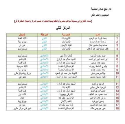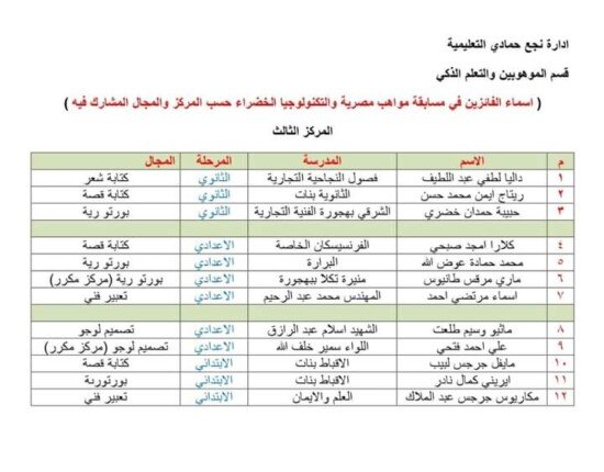 أعلن قسم الموهوبين والتعلم الذكي بإدارة نجع حمادي التعليمية التابعة لمديرية التربية والتعليم والتعليم الفني، النتيجة النهائية لمسابقة "مواهب مصرية والتكنولوجيا الخضراء".