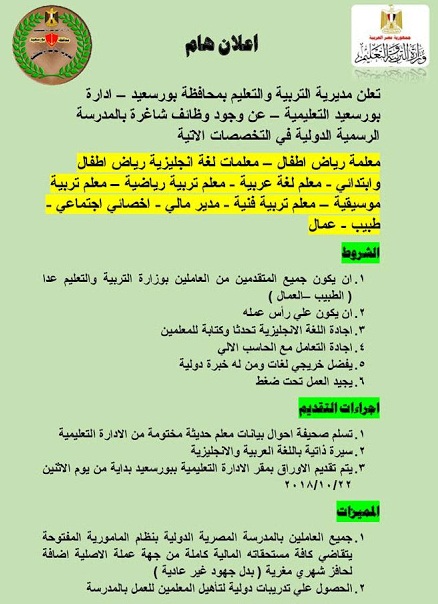 أعلنت مديرية التربية والتعليم بمحافظة بورسعيد، عن وجود وظائف شاغرة بالمدرسة الرسمية الدولية فى التخصصات التالية "معلمة رياض اطفال، معلمات لغة انجليزية رياض اطفال وابتدائي، معلم لغة عربية، معلم تربية رياضية، معلم تربية موسيقية، معلم تربية فنية، مدير مالي، أخصائي أجتماعي، طبيب، عمال".
