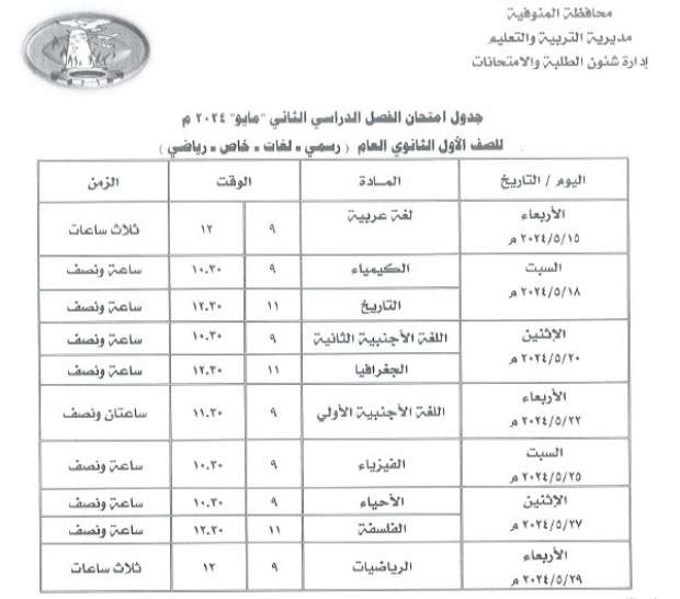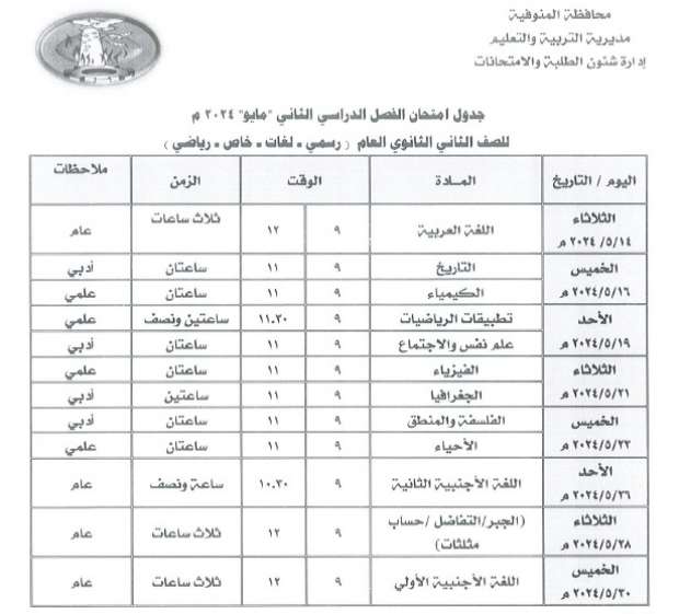 أما جدول امتحانات الصف الثاني الثانوي الترم الثاني بالمنوفية فجاء كالتالي: