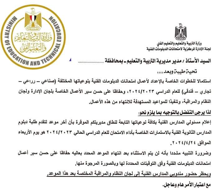يأتي ذلك، استعدادا لامتحانات الدبلومات الفنية التي تنطلق 25 مايو المقبل وتستمر حتى 10 يونيو 2024.