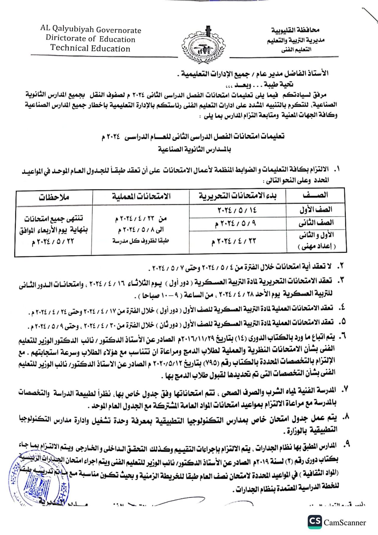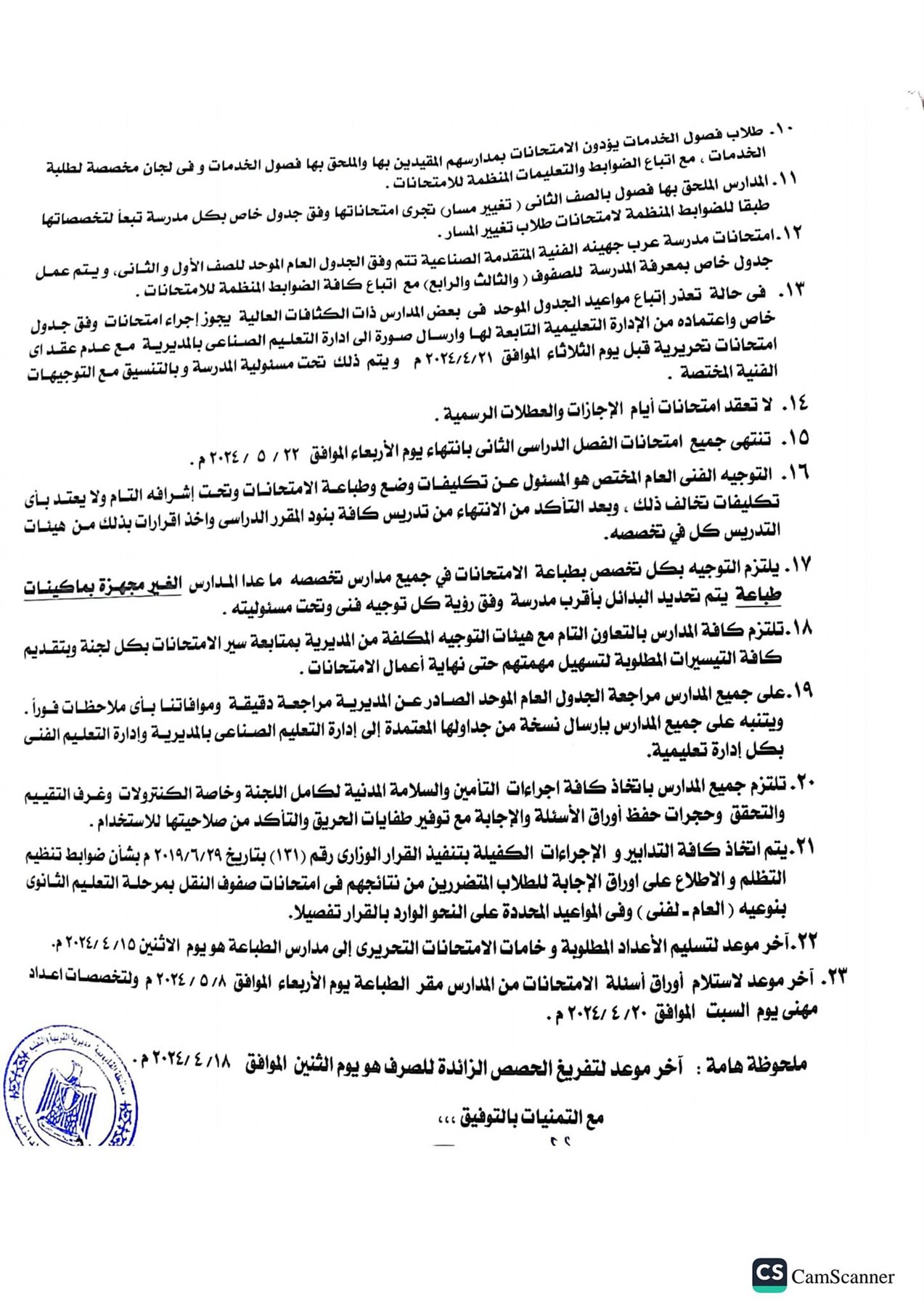 - في حالة تعذر إتباع مواعيد الجدول الموحد في بعض المدارس ذات الكثافات العالية يجوز إجراء امتحانات وفق جدول خاص واعتماده من الإدارة التعليمية التابعة لها وارسال صورة إلى ادارة التعليم الصناعى بالمديرية مع عدم عقد اى الفنية المختصة امتحانات تحريرية قبل يوم الثلاثاء الموافق ٢٠٢٤/٤/٢١م ويتم ذلك تحت مسئولية المدرسة وبالتنسيق مع التوجيهات