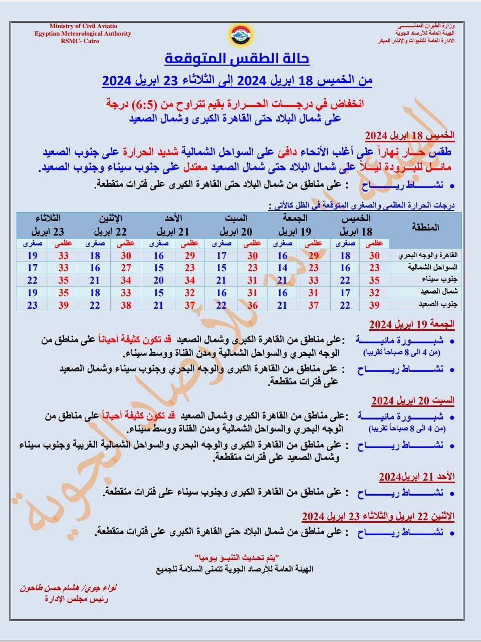 يشهد الطقس نشاط للرياح، على مناطق من القاهرة الكبرى والوجه البحري والسواحل الشمالية الغربية وجنوب سيناء وشمال الصعيد، على فترات متقطعة،كما يشهد شبورة مائية تبدأ من الرابعة صباحًا وتستمر حتى التاسعة صباحًا تقريبًا، على مناطق من القاهرة الكبرى وشمال الصعيد، قد تكون كثيفة أحيانًا على مناطق من الوجه البحري والسواحل الشمالية ومدن القناة ووسط سيناء.