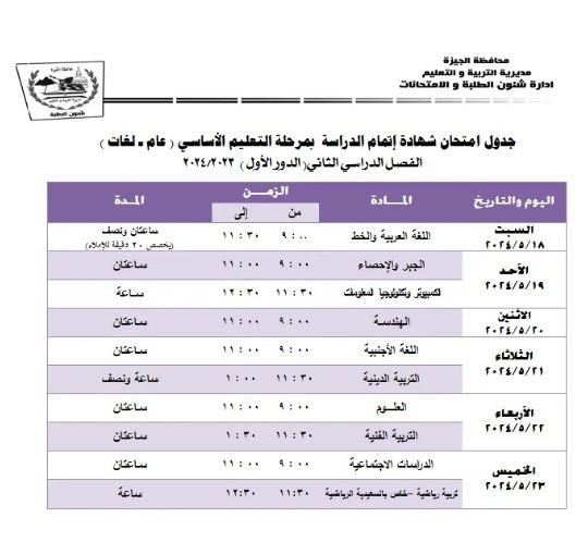 جدول امتحانات الصف الثالث الإعدادي محافظة الجيزة الترم الثاني 2024