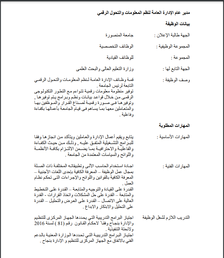 أعلنت جامعة المنصورة عن وظائف قيادية شاغرة، لشغل منصب "مدير عام الإدارة العامة للتطوير المؤسسي - مدير عام الإدارة العامة لنظم المعلومات والتحول الرقمي"، والتقديم لوظائف جامعة المنصورة خلال الفترة من 2024/04/15 حتى 2024/05/19.