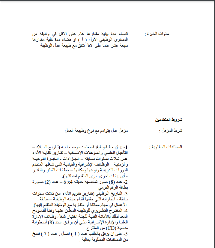 1- بيان حالة وظيفية معتمد موضحًا به (تاريخ الميلاد – التأهيل العلمي والمؤهلات الإضافية – تقارير كفاية الأداء عن ثلاث سنوات سابقة – الجزاءات - الخبرة النوعية والزمنية – الوظائف الإشرافية والقيادية التي شغلها المتقدم الدورات التدريبية ونوعها ومكانها – خطابات الشكر والتقدير - أى بيانات أخرى يرى المتقدم إضافتها).