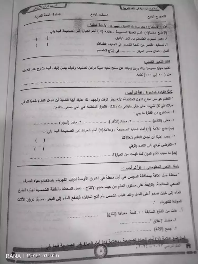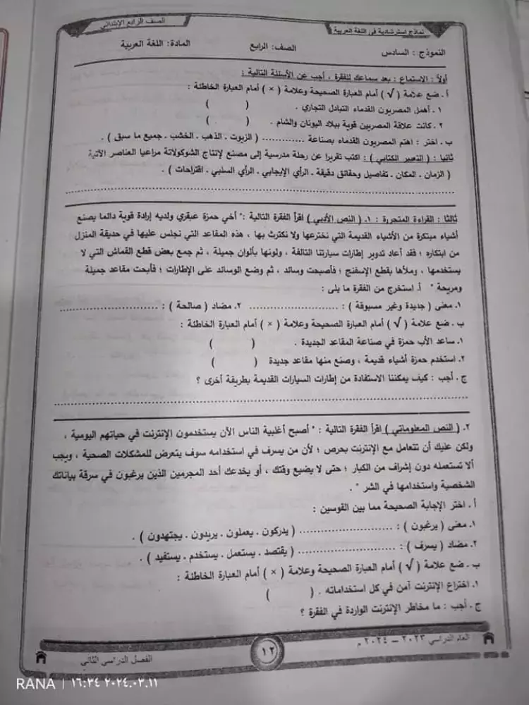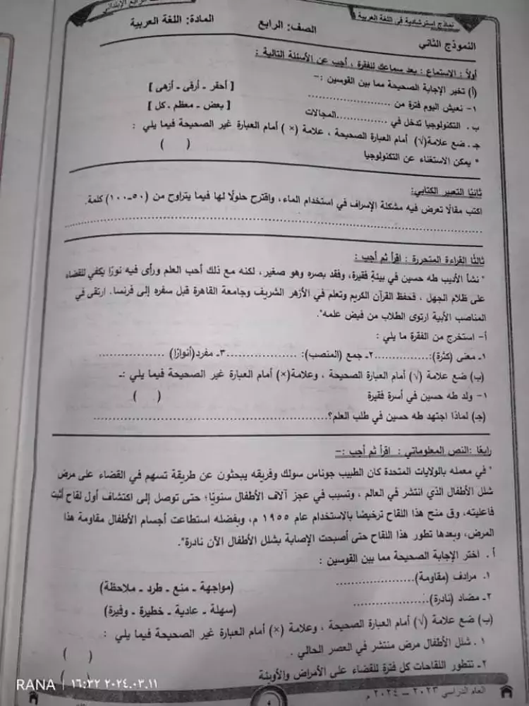 نماذج امتحانات لغة عربية للصف الرابع الابتدائي الترم الثاني 2024